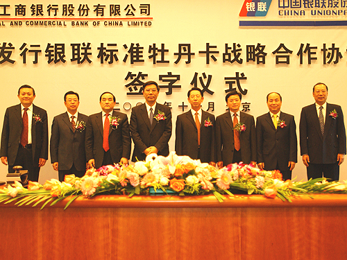Mr. Jiang Jianqing indicated in his speech that after the establishment of Industrial and Commercial Bank of China Limited, the signing ceremony marked an importance advance by China companies to frame their own banking card brand together in China. It was also a great event worth celebration in China bankcard industry this year. Both parties will form strategic partnership and complete each other in many aspects such as UnionPay Standard Peony Card issuance, cardholder service scheme enhancement, Peony Card transaction quality improvement and emerging payment technology and services launch. In addition, ICBC and China Union Pay agreed to work closely together to face the challenges and international competition when banking industry fully open to the world after China's accession to WTO. Both companies are well positioned to achieve their goal to create a competitive China bankcard brand in the world.