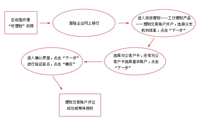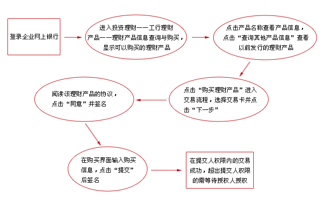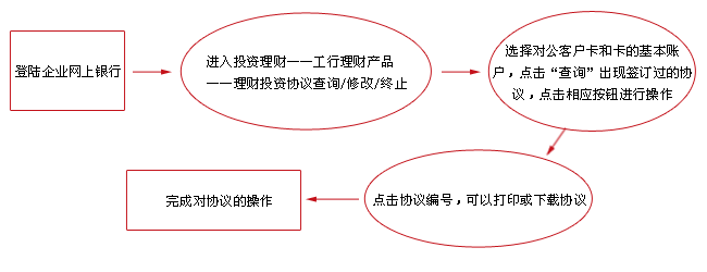 ● 如何利用企業網上銀行購買產品? 1. 理財賬戶開立:查看流程 2. 理財產品信息查詢與購買:查看流程 3. 理財產品持有份額查詢/贖回/終止:查看流程 4. 理財交易撤單:查看流程 5. 理財交易賬戶銷戶:查看流程 6. 理財交易指令批覆:查看流程 7. 理財投資協議查詢/修改/終止:查看流程