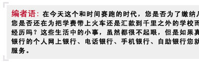 或許您對我行的這些代理繳費業務還很陌生,進來看看吧,這裏囊括了學費、電話費、電費等生活中常用到的繳費服務。也許不經意的一瞥,讓您不用再在網點排隊繳費,在線繳費,生活更輕鬆… [更多>>] |