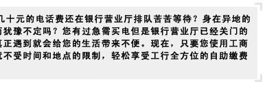 | 在銀行等上半個小時只爲了繳幾十塊錢的手機費?別把時間浪費在等待上了。使用工行的網上銀行即可輕鬆繳納手機話費,您還可以選擇使用有自動扣費功能的繳費通業務。[我要繳費] |