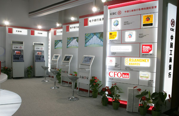 做爲中國最大的商業銀行,中國工商銀行也參加了此次金融服務展,並以其鮮明的展臺形象吸引了衆多參觀者的注意。據介紹,此次工商銀行整個展覽設計以“服務與創新”爲主題,以該行整體實力與日益國際化、現代化的企業形象爲背景,突出表現該行的創新能力與創新成果,集中展示了該行全心全意的服務理念與全面專業的服務能力。展覽中,工商銀行採用了實際體驗、人工服務與多媒體、圖片及適量文字展示的形式,對該行整體形象、科技實力、電子銀行業務、個人金融業務及銀行卡業務等內容進行突出展示。