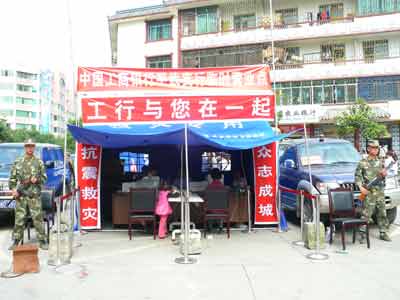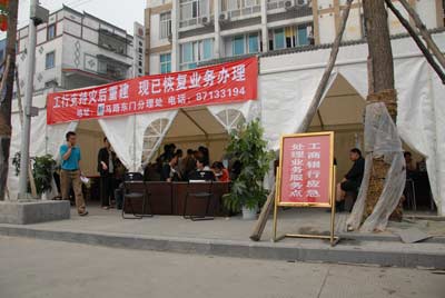 (圖二)大地震發生後,工行平武支行員工在“帳篷銀行”裏堅持營業