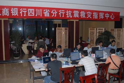 (圖五)工行四川省分行抗震救災指揮中心幹部員工夜以繼日的工作