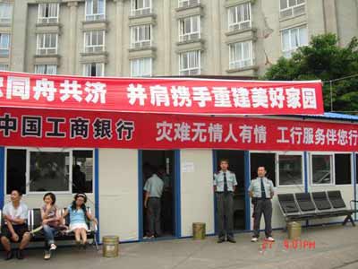 據介紹,目前,工商銀行設在四川綿竹市的第一個“板房銀行”已於5月27日正式對外營業,設在都江堰市的3個“板房銀行”也即將投入使用。與此同時,該行四川省分行在成都、德陽、綿陽等地的10餘家“板房銀行”也將於本週內全面開工,並在最短的時間內正式對外營業。