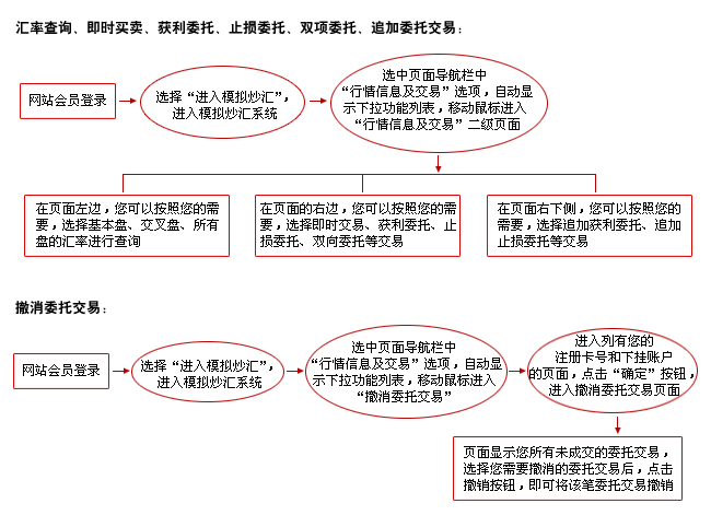 (三)行情信息及交易。爲您提供匯率查詢、即時買賣、獲利委託、止損委託、雙項委託、追加委託及撤消委託等交易功能。查看流程>>